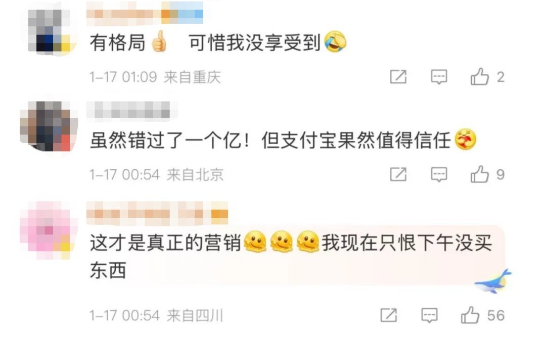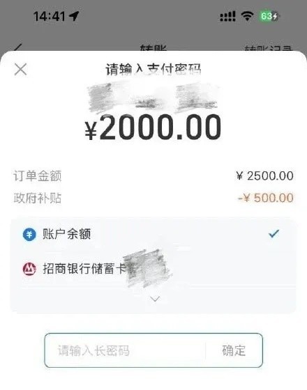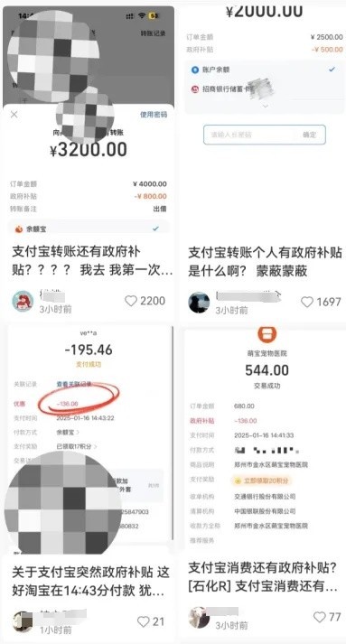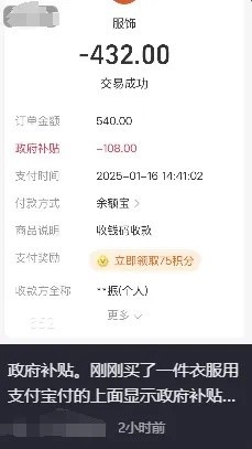 该网友称:“从目前的情况看,在购物、还信用卡、缴纳签证等场景下,在14:40-14:45期间,所有订单都被政府补贴减免20%。疑似支付宝在测试国补时出现线上漏洞,导致所有人线上支付可以直接使用国补减免。”