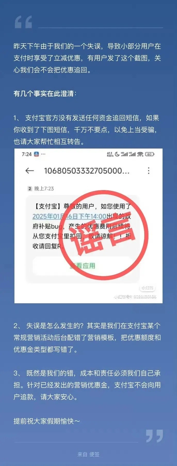 3.既然是我们的错,成本和责任必须我们自己承担。针对已经发出的营销优惠金,支付宝不会向用户追款,请大家安心。