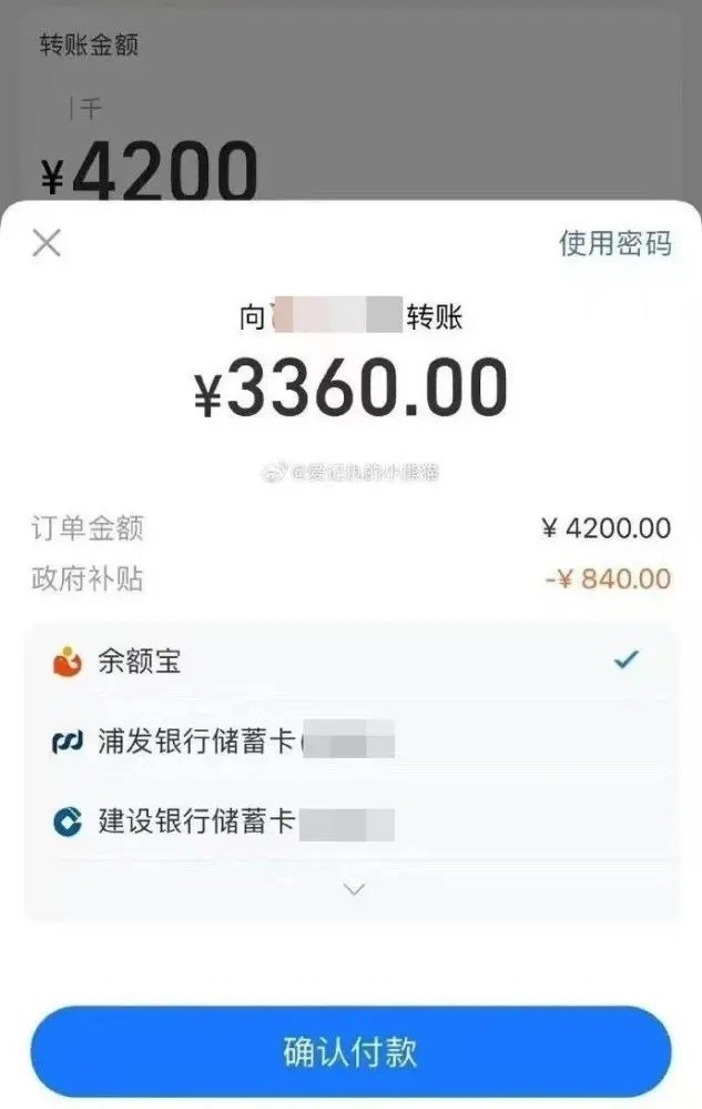 记者注意到,已有用户在社交平台分享了自己使用支付宝的订单,相关图片显示,这些订单中均出现“政府补贴”,补贴额约20%。其中,有人网购了一件价值540元的衣服,在使用支付宝付款时,付款页面显示,政府补贴108元。甚至有人在转账时也出现了补贴。